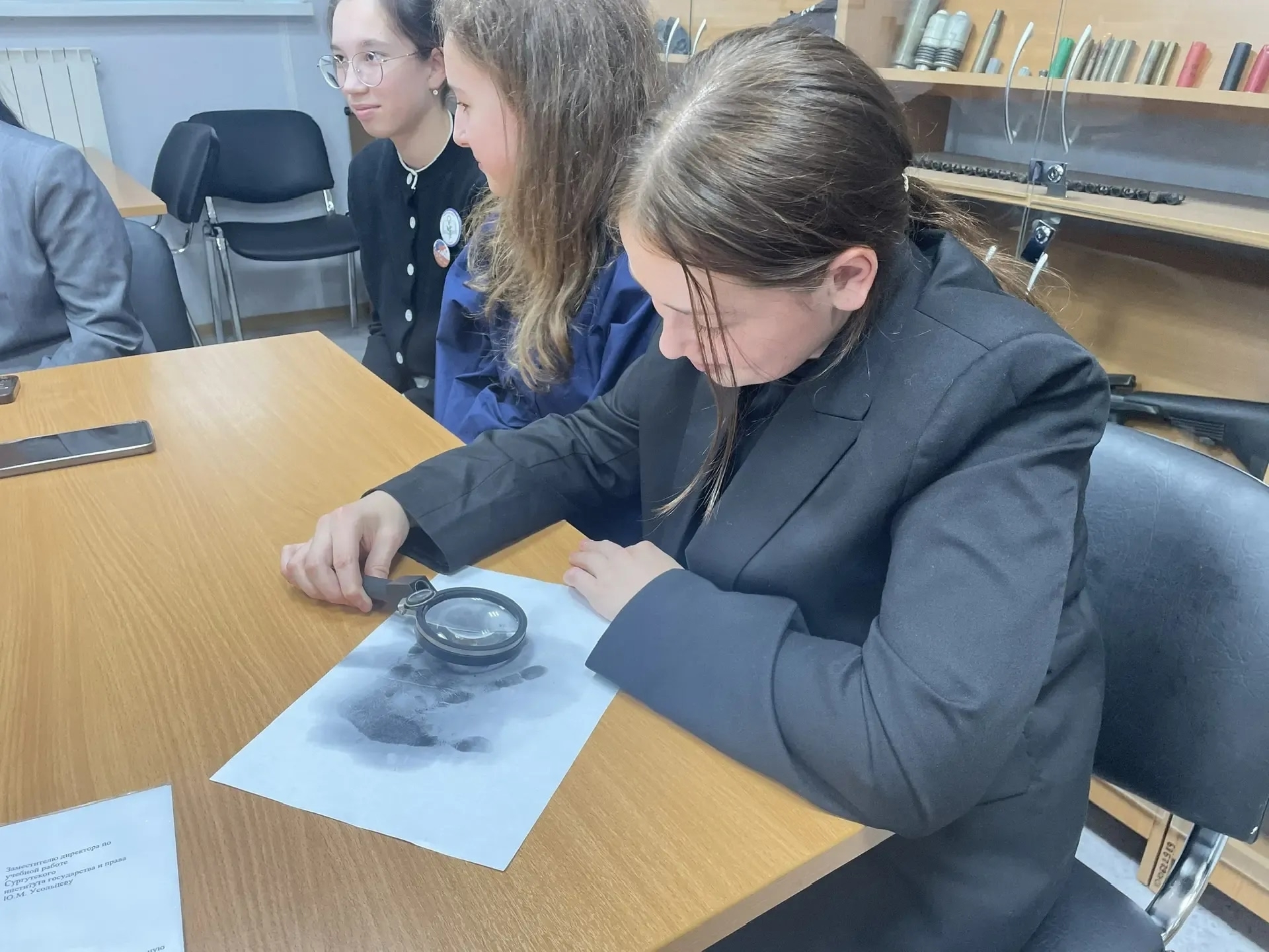 В рамках профориентационной работы на базе криминалистической лаборатории факультета уголовного права и процесса БУ ВПО ХМАО-Югры "Сургутский государственный университет" 20 октября обучающиеся из 8 д класса, 9 д и актив школьного отряда,,Юные Жуковцы,, с 5 по 7 классы вместе с педагогами Мерк Татьяной Михайловной и Чобиток Ольгой Андреевной посетили лекцию-экскурсию. В ходе встречи ребят встретили и ознакомили студентки 2 и 3 курса этого факультета с содержательной стороной обучения в ВУЗе по специальности юрист, криминалист. А во 2 части экскурсии заместитель директора по учебной работе Сургутского института государства и права, преподаватель ВУЗа лаборатории по криминаистике-Усольцев Юрий Михайлович показал экскурсантам образцы криминалистической техники. В лаборатории криминалистики, учащиеся смогут увидели коллекцию различного холодного оружия, состоящего из ножей, заточек, вскрытых замков, экспонаты фото роботов, фальшивых купюр, и многое другое и особенно впечатлил ребят практический момент,это приём как снимают отпечатки пальцев с помощью криминалистического оборудования. Преподаватель кафедры Юрий Михайлович рассказал также об истории криминалистики и её возможностях на сегодняшний день, продемонстрировал технологию применения криминалистических средств по обнаружению следов и объектов при раскрытии преступлений. Все учащиеся с 5 по 9 классы остались под большим впечатлением от услышанного и увиденного. Все усвоили главный совет,который Юрий Михайлович проговорил несколько раз: Учитесь, ребята, всем наукам, все учебные предметы важны и нужны в жизни:и математика, и музыка, и физика, и стория и многие другие,,.